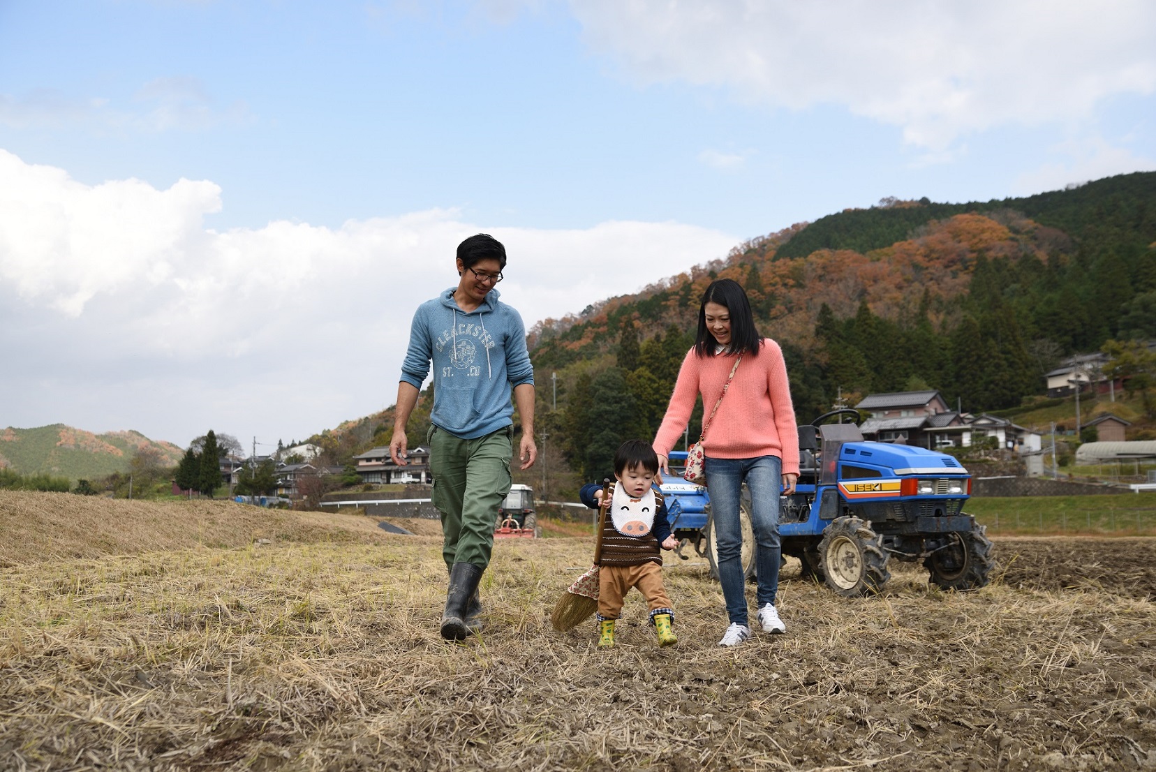 夫の信幸さんは京都府宇治市出身。東京でフォトグラファーとして活躍した後、福知山へIターン。実践農場で2年の研修を経て、2018年独立。仲間と一緒に万願寺とうがらしを栽培している。妻の亜希さんは、夫の就農をきっかけに大阪府寝屋川市から福知山市三和町へ移住。地域の皆さんに見守られながら、1歳6か月になる長男、ときちゃんの子育て中。