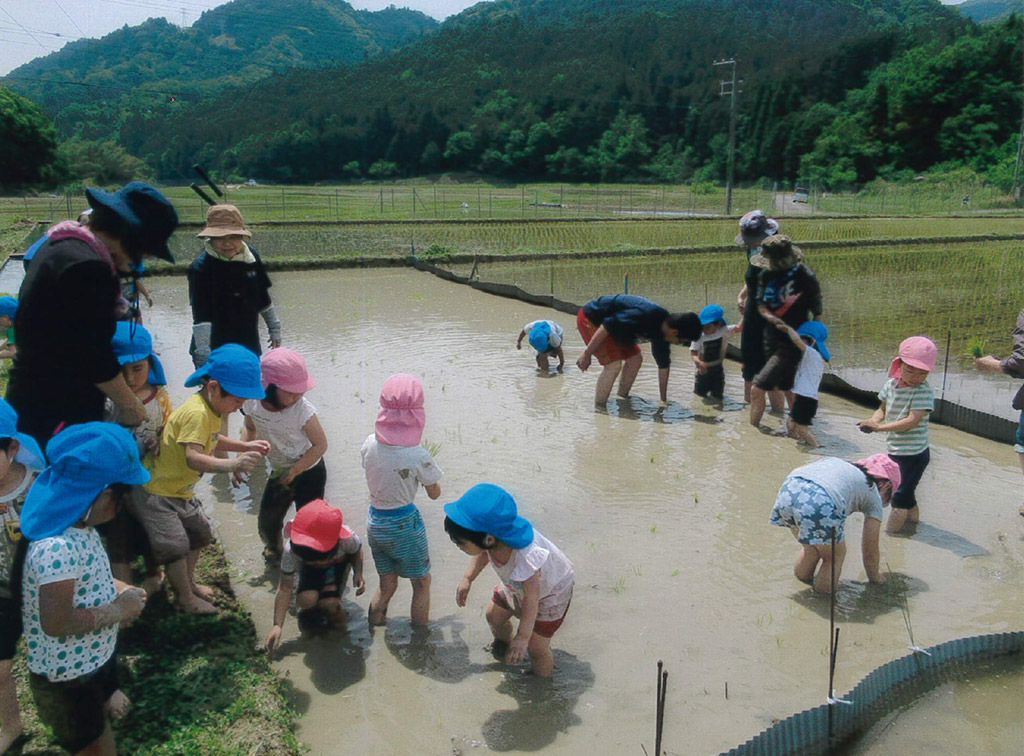 地域の田んぼでの田植えから稲刈り、収穫祭、川遊びや山遊びなど、自然を体感しながら里山の暮らしを受け継いでいきます。