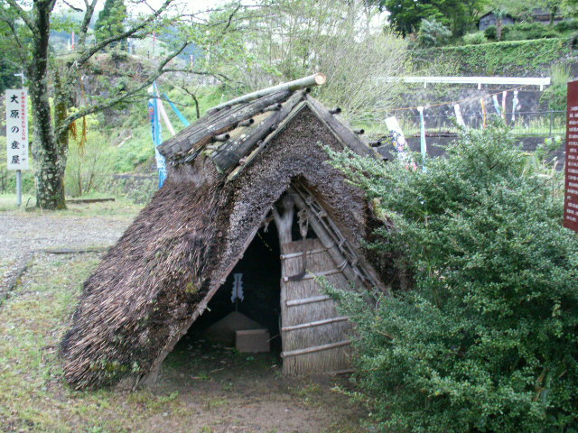 大原の産屋は、切妻屋根をそのまま地面に伏せたような、古い建築様式で作られているもので、この中に七日七夜の間こもって出産するという習慣が大正の頃まで続いていました。