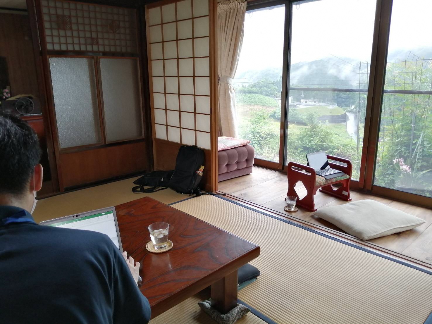 三岳山天空の宿は、通常時、農家民宿として営業されていて、主にこの8畳2間を自由に使えます。Wifi環境も整備され、オンライン会議には十分な速度が確保されています。携帯電話の電波は0から2。都会の喧騒からも解放されます。