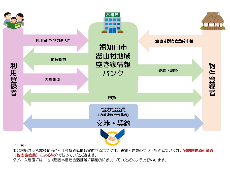 福知山市の農山村地域にある空き家などの賃貸・売却を希望する所有者に、「空き家情報バンク」に登録していただき、その情報を空き家の利用希望者へ提供することで、空き家所有者と利用希望者をつなぐ制度です。