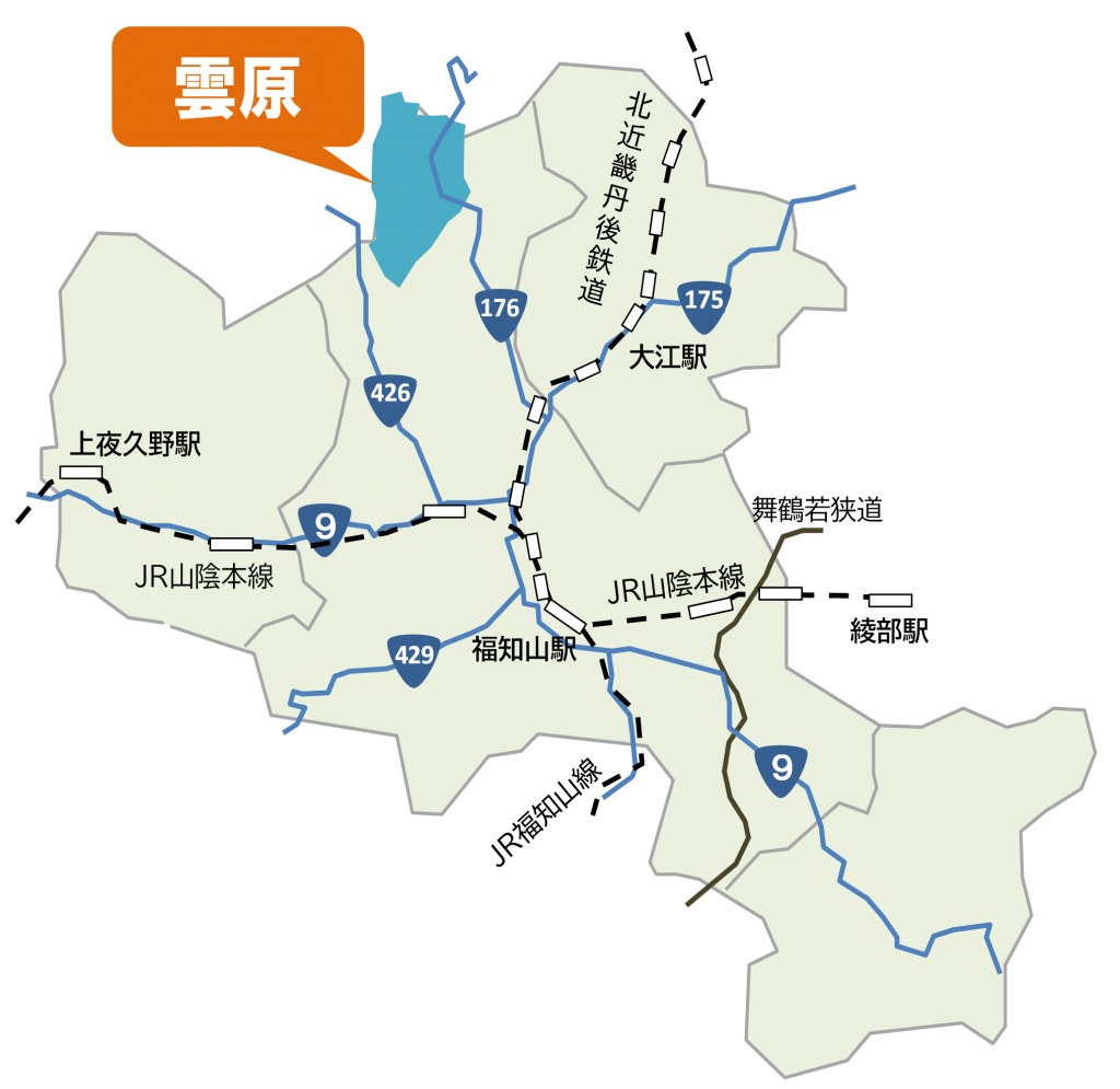京都府北西部に位置する雲原地区。緑豊かな大地とのどかな農村風景が広がります。当地区では、地域の拠点づくりや地域イベントの開催、雲原応援団(雲原ファミリー)募集など地域に関わる方を増やす取り組みを積極的に行っています。既に先輩移住者が多くいますので、地域に馴染むためのフォロー体制があり、地域間や世代間などで交流を深めています。行政とも協力しながら移住を検討されている段階から実際に移住した後までサポートした体制を作っています。