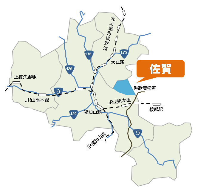 京都府福知山市の北東部に位置する佐賀地区。佐賀地区は由良川北岸の田園地帯で、山沿いに家々が点在しており、のどかな農村風景が広がります。福知山の中心市街地から車で約20分に位置し、最寄り駅はJR山陰本線「石原(いさ)駅」まで約10分となっています。
