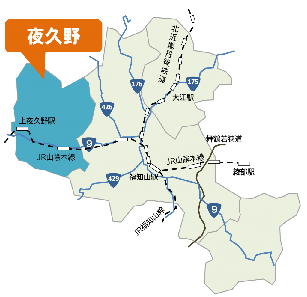 京都府北西部に位置する夜久野町。東経135度の標準時子午線の通る日本の真ん中の地です。美しい自然に囲まれ、京都府唯一の火山である宝山の噴火による水はけの良い火山灰で育つ高原野菜や夜久野ぶどうやムベなどの果物が特産品となっています。