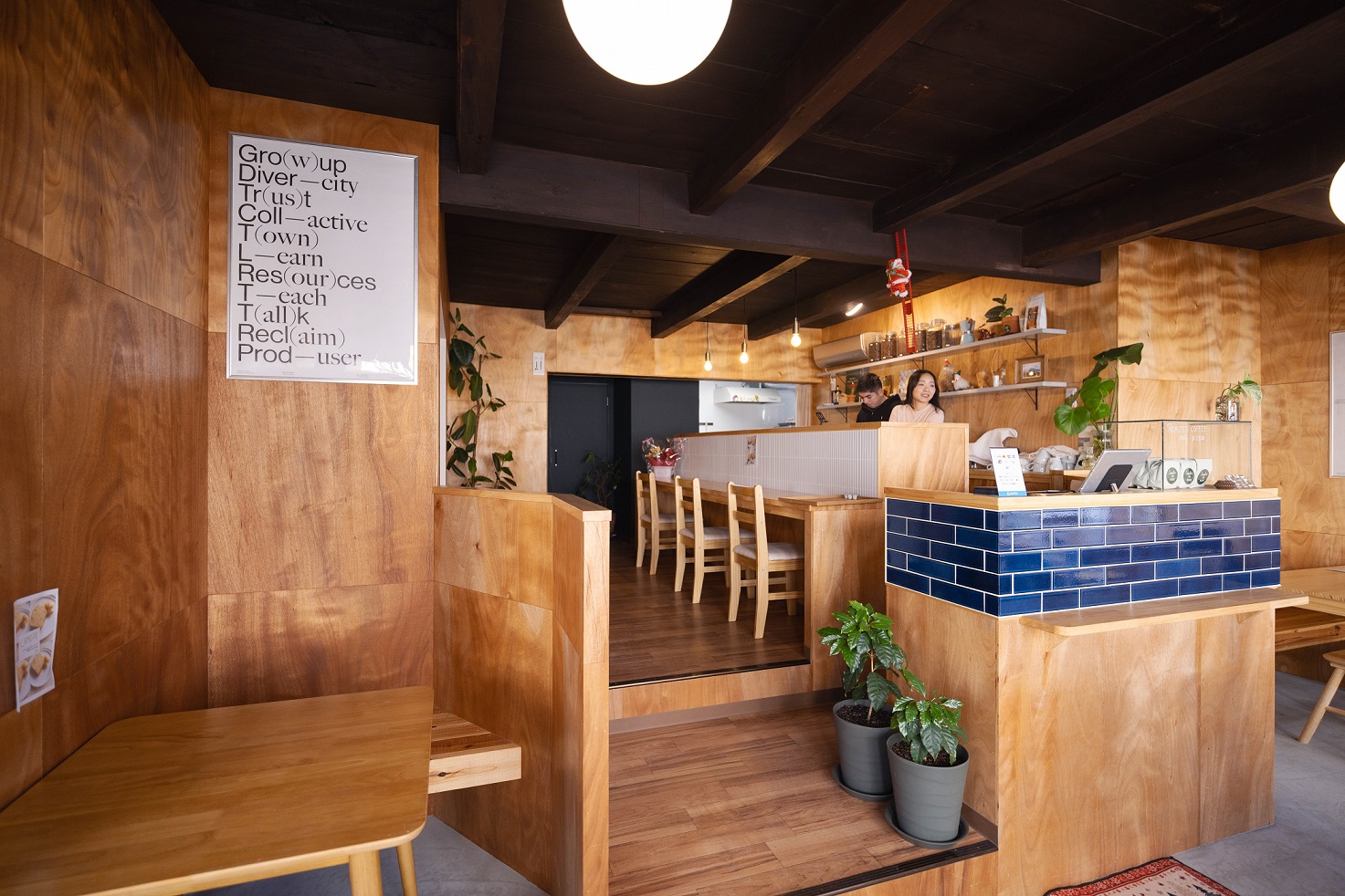 ガラス店だった場所は、木目調の落ち着いた雰囲気の内装にリノベーションし、2人のカフェに生まれ変わりました。