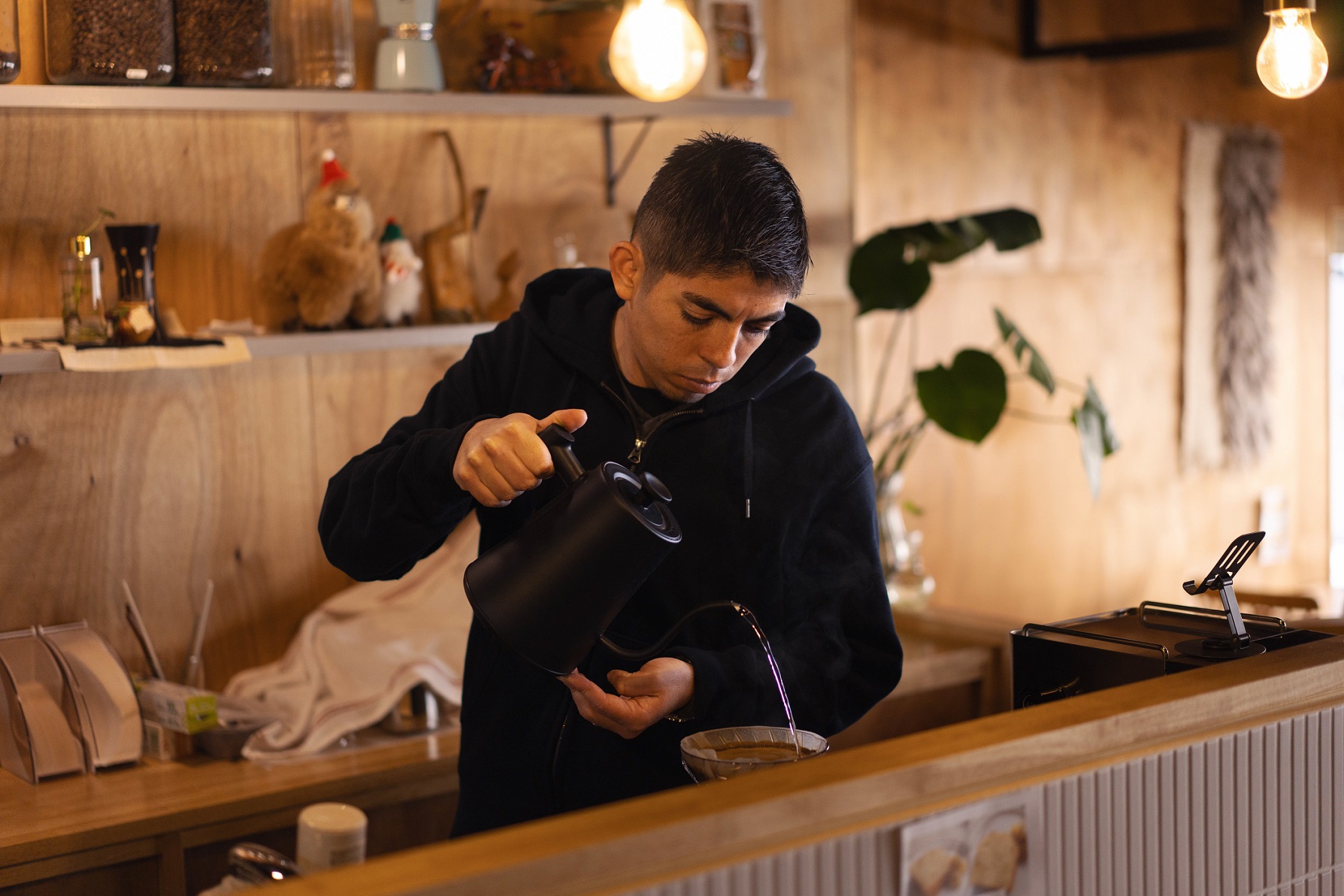 ホルへさんは、エクアドルでコーヒー農園を一軒一軒バイクで回り、コーヒーの栽培指導を行っていた、また、焙煎についても職員の焙煎士から直接指導を受けていたいわばコーヒーのプロフェッショナル。一粒の豆から木になって収穫するまでの全工程に携わってきたからこそ、豆の状態に合わせてどのようにドリップしたらおいしくなるかがわかると言います。