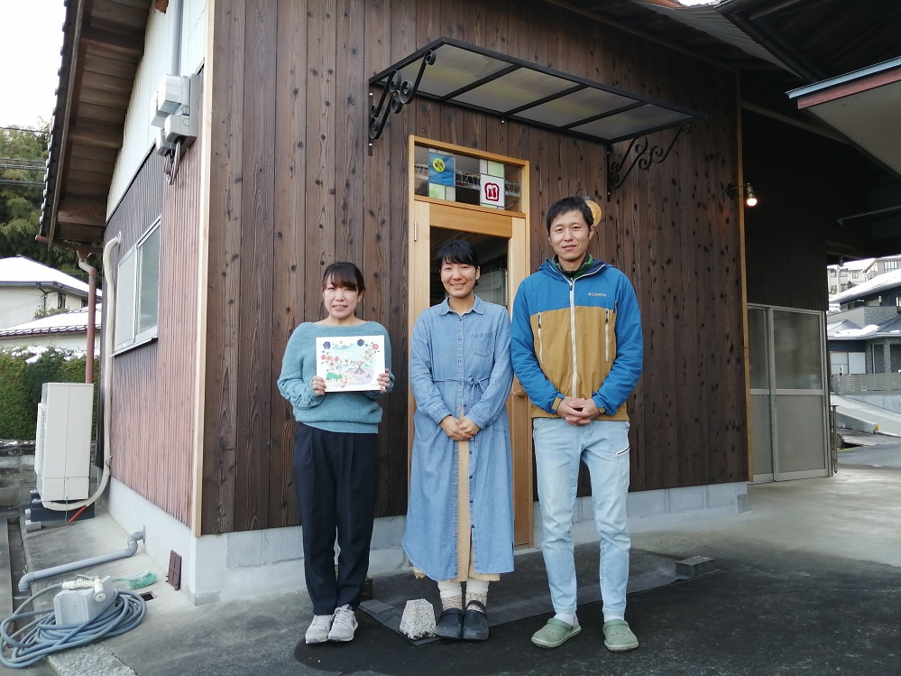 ▲まころパンの工房前にて 左から安岡さん、岩切康子さん、岩切啓太郎さん