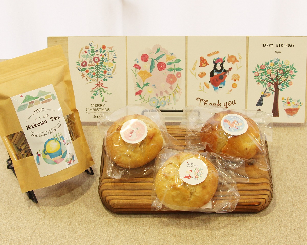 翌年の2019年4月、康子さんが、「まころパン」を本格的にスタートさせる。86farmで育てた小麦や野菜を使ったパンも作られている。まころパンといえば、2018年の「福知山 丹波くりスイーツアイデアコンテスト」でプロ部門グランプリ受賞というのが記憶に新しいが、安心安全を求める子育て世代に特に人気なのがどうぶつパンだ。ひとつひとつ少しずつ表情が違うので、ついつい真剣に選んでしまう。