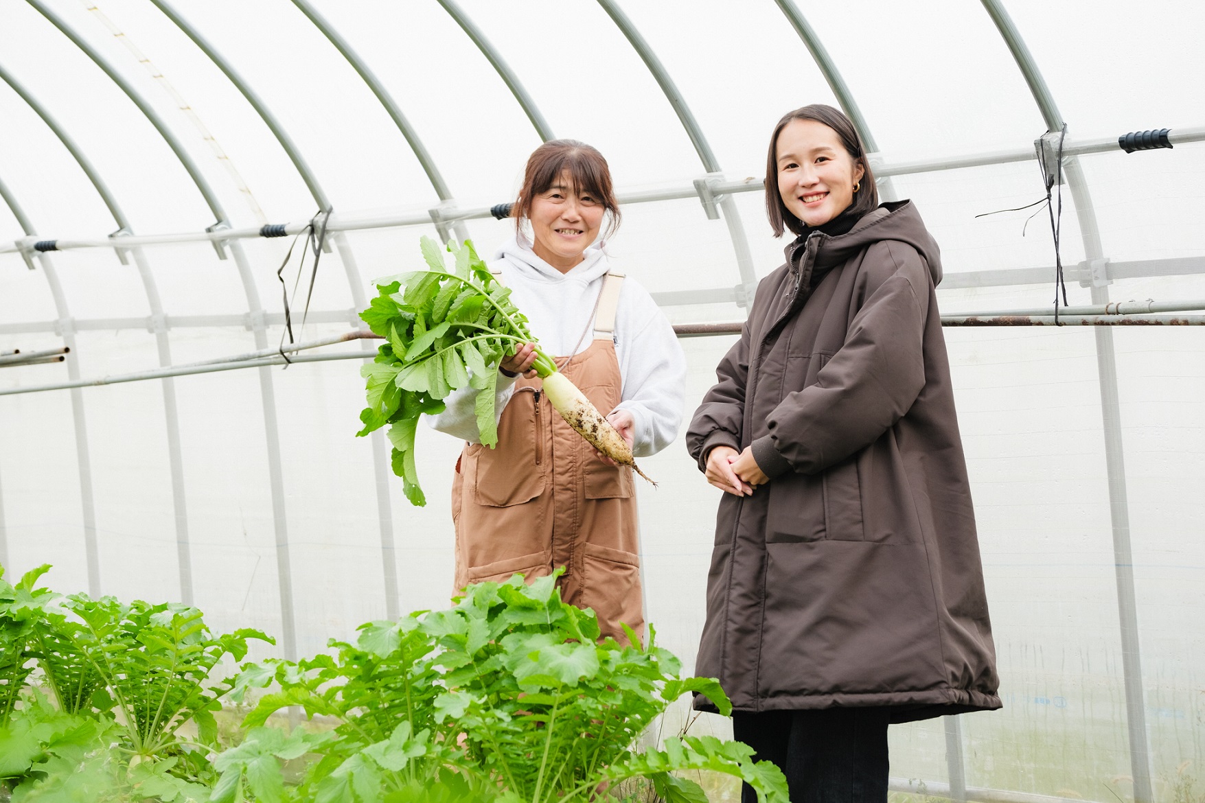 ▲小林ふぁ〜むの畑でとれた大根と小林加奈子さん