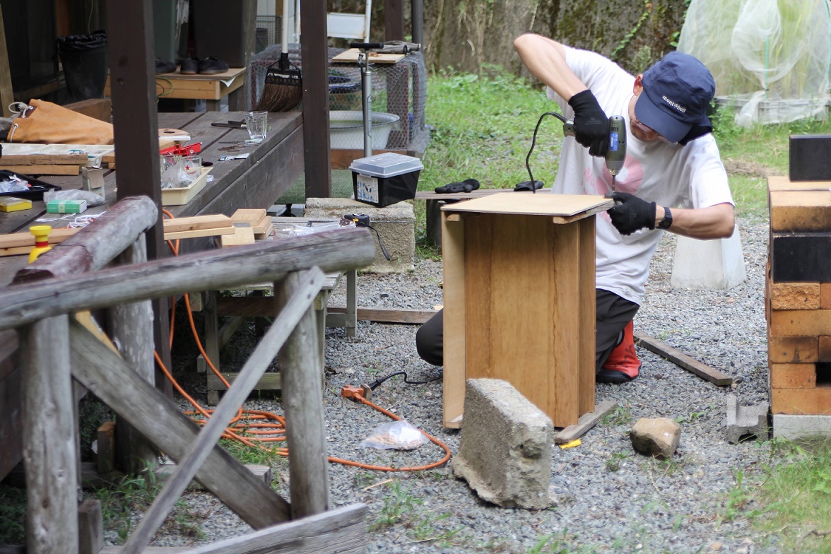 自宅の庭には、泰子さんの夫が手作りしたピザ窯や飯盒炊さんのための設備がある。泰子さんが育てた野菜を使って料理を作り、庭を眺めながら外で食事をする。自分たちできることは自分たちでやってみることをモットーに田舎暮らしを心から楽しんでいる。収穫作業が忙しい時期は、夫が泰子さんの畑を手伝うこともあるそうだ。