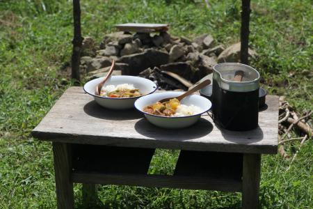 △子どもの頃のわくわくした気持ちで飯盒炊さん。火起こしは夫が担当。