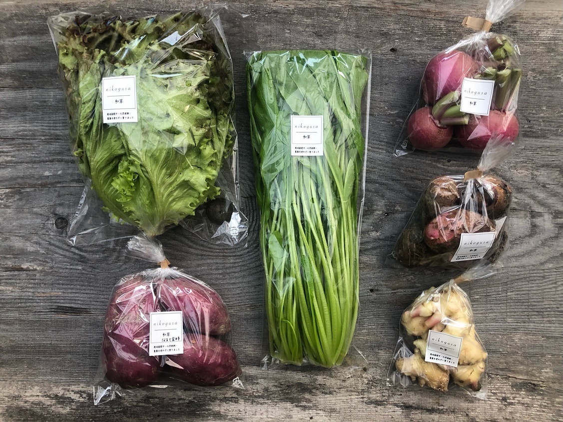 △「和草」というオリジナルブランドで市内のマルシェで販売中。和草(にこぐさ)とは、「柔らかい葉っぱや茎」を意味する言葉。収穫前の野菜を摘み取って初めて味わった時の感動(初心)を忘れないようにとのこと。