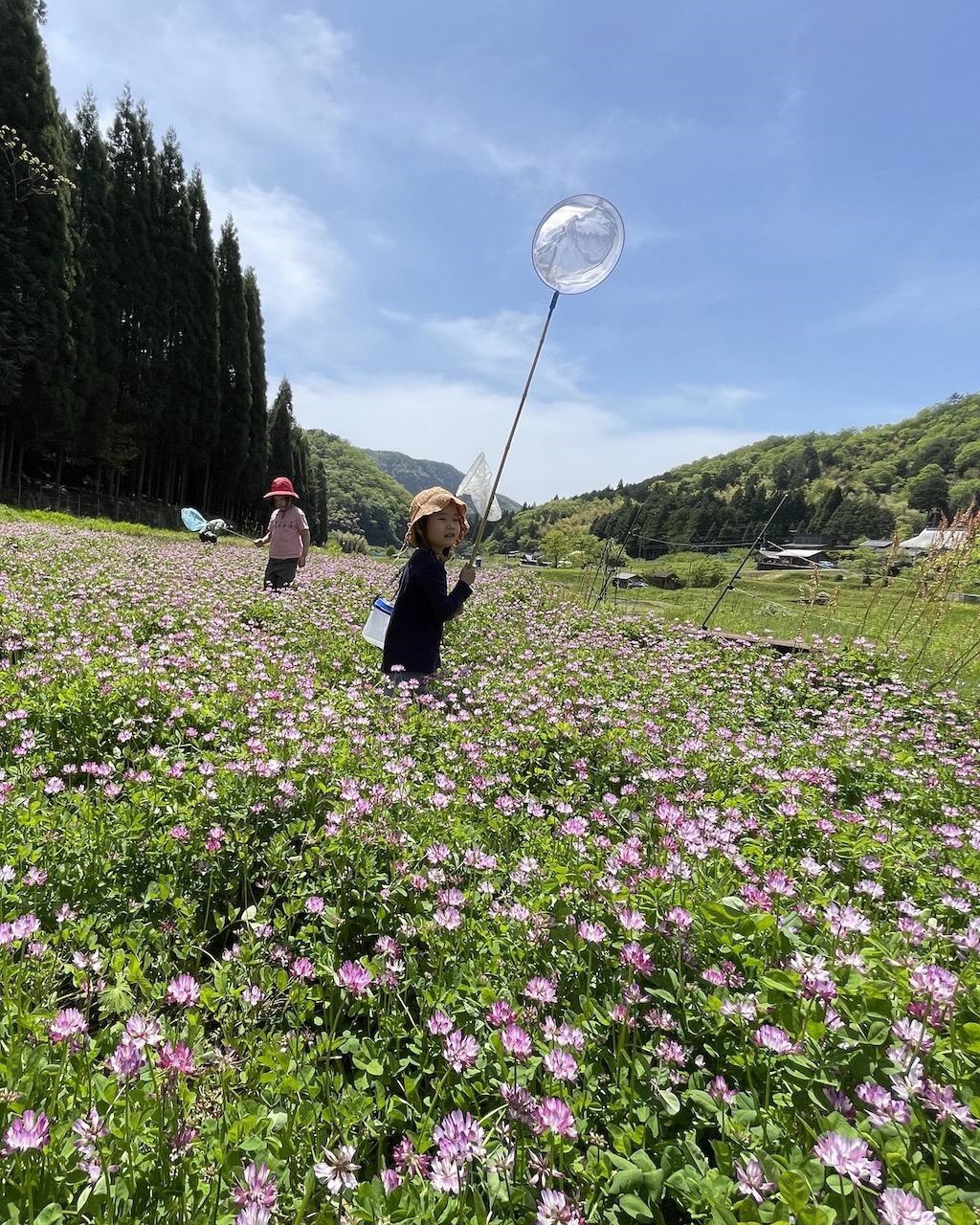 (山村さんのお子さんと友だちがレンゲ畑で遊ぶ様子/山村さん提供)