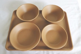 ▼間伐材を活用した学校給食食器